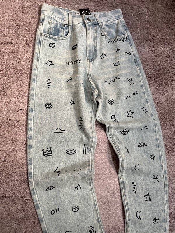 Pantalón de jeans pintando a mano con dibujos, modelo mom rígido.