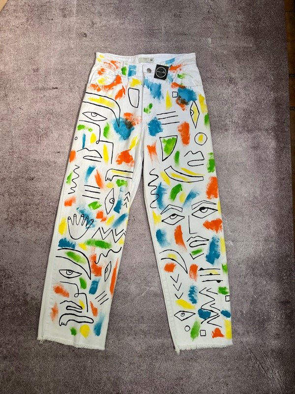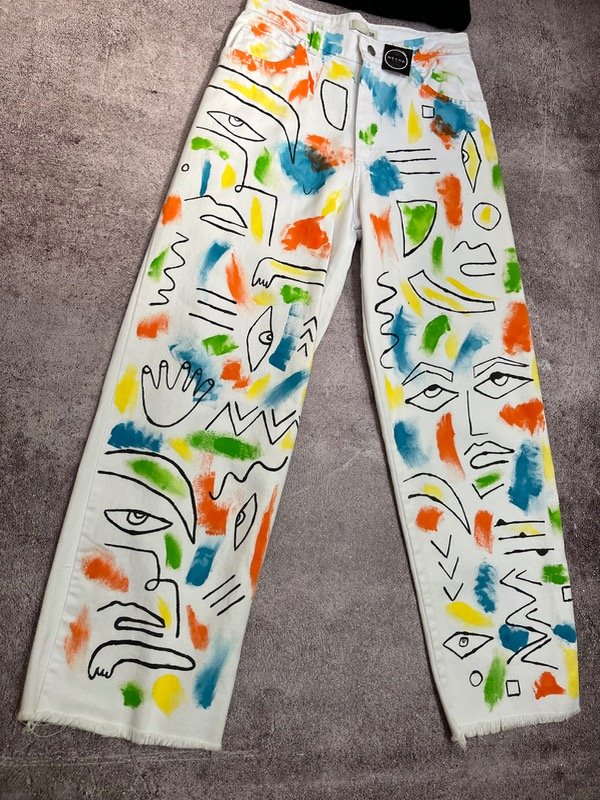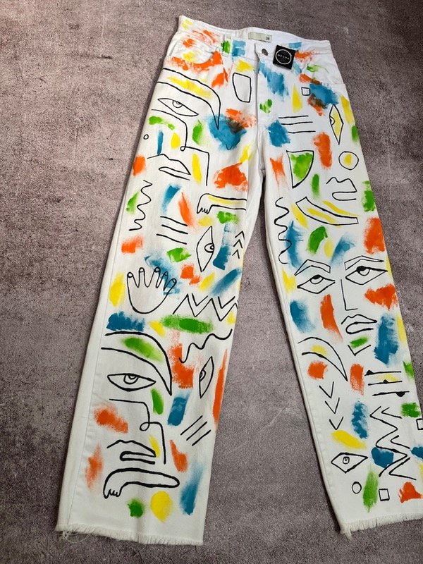 Jeans blanco wide con diseño caras pintado a mano