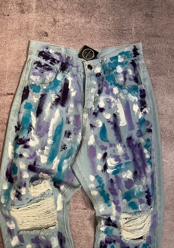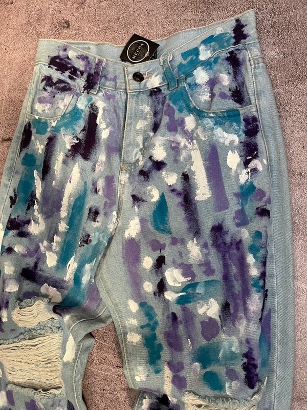 jeans de diseño pintado a mano , mom rígido . Rotura en las rodillas
